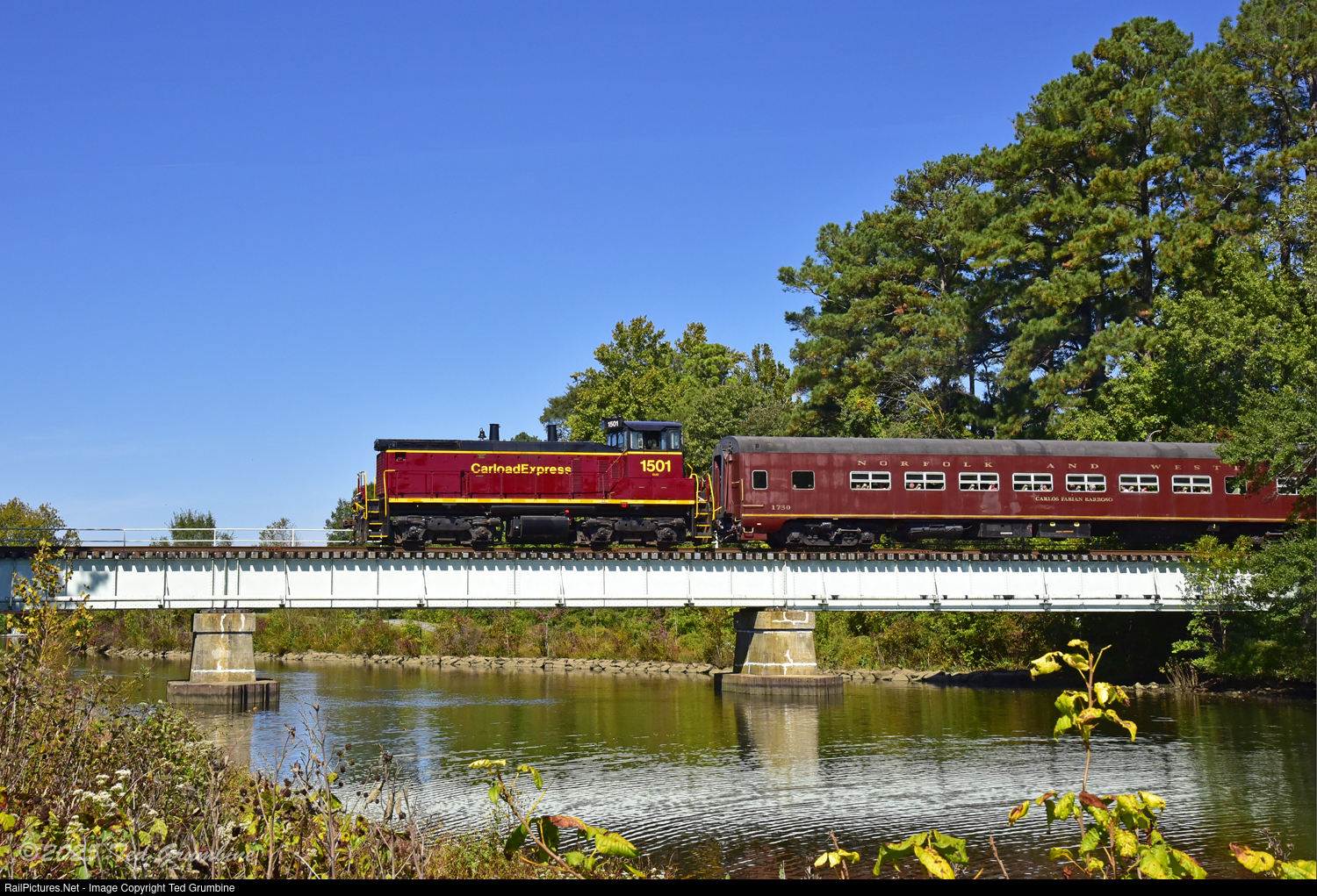 After changing ends east of the creek, the crew of the Hurlock “Fall Festival Express” (12:30 dp), aboard SW1500 #1501, takes the train westbound, across the Marshyhope Creek bridge and back to Hurlock.