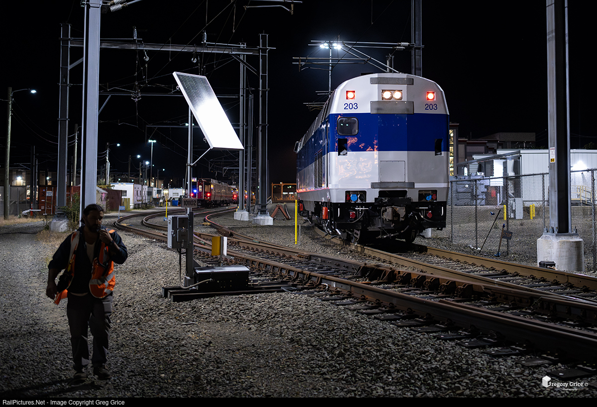 On the evening of October 4th, 2025, Metro-North Railroad’s “New Haven Extra Switcher” takes "M Central" heritage-painted P32AC-DM, MNCW 203, down Track 96 to run around the CCO building in Ne Haven Yard. 203, along with several other locomotives, had been on display earlier in the day for the railroad’s 2025 Open House at the Component Change Out (CCO) building. Once the event concluded, crews worked to get the locomotives back together for their return trip to Croton Harmon Yard, where they would be placed back into service.