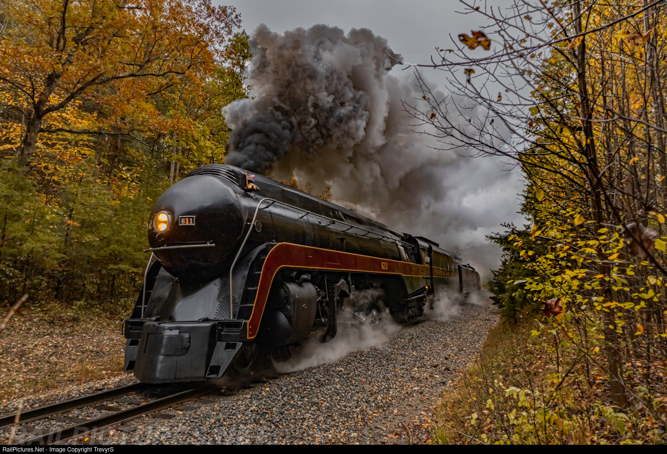 N&W 611 thunders through some fall foliage.