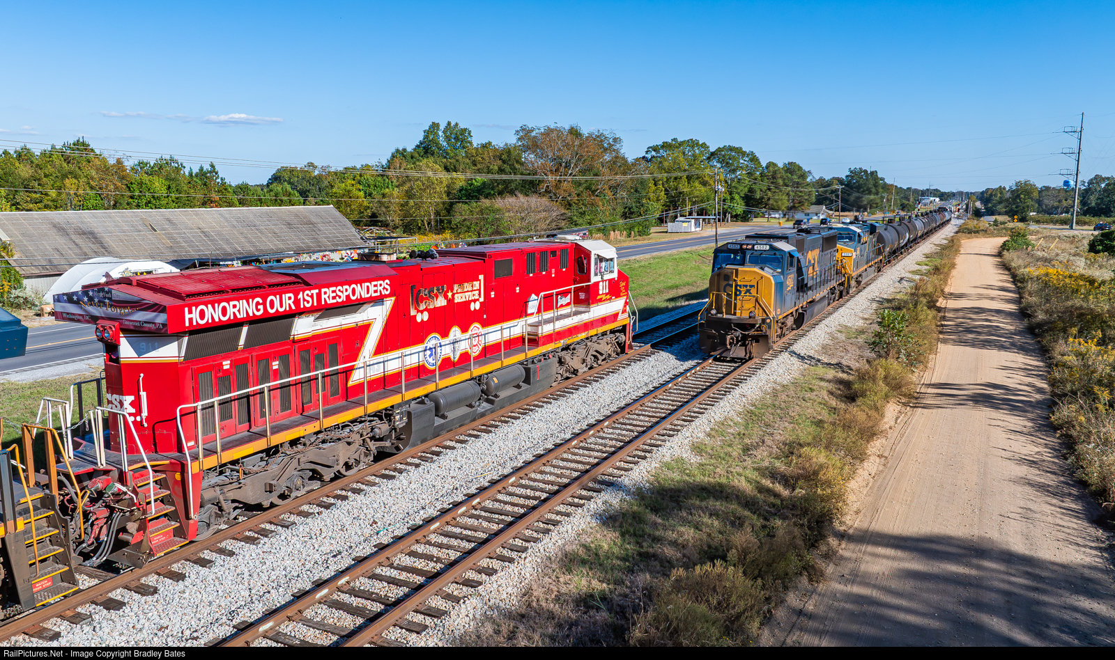 | CSXT SD70AC #4582 leads train M524 into the siding at Jemison as CSX's 1st responder's locomotive #911 holds the main line as it leads southbound Coal Train C237-11 bound for Mobile, AL. |