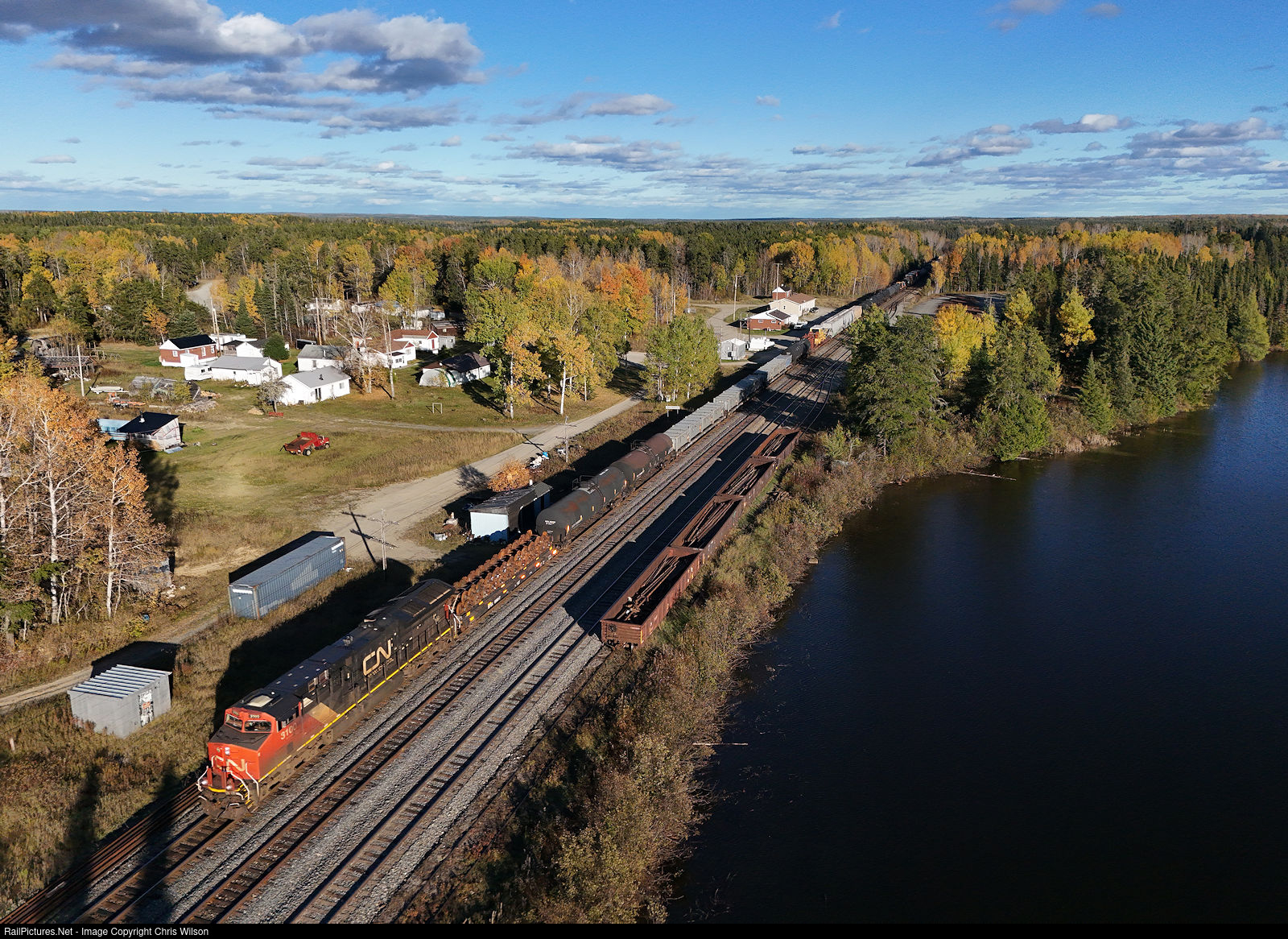 CN ET44AC 3100 is tasked with getting 78 cars of freight between MacMillan Yard in Toronto, Ontario to Symington Yard in Winnipeg, Manitoba. This past summer Hillsport got a full upgrade with new ties, ballast, and PW CWR installed on the old Manitouwadge main replacing 100 year old 80lb stick rail. (2nd track from right) Clean up is well underway removing scrap ties and four gondolas are loaded with scrap rail ready to go in the backtrack.