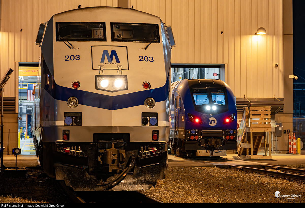 On the evening of October 4th, 2025, Metro-North's 40th Anniversary "M Central" heritage-painted P32AC-DM, MNCW 203, idles on Track 95 as the "New Haven Extra Switcher" crew prepares to take Siemens SC-42DM #303 off Track 94 at the CCO building in New Haven Yard. 203, along with several other locomotives, had been on display earlier in the day for the railroad’s 2025 Open House at the Component Change Out (CCO) building. Once the event concluded, crews worked to get the locomotives back together for their return trip to Croton Harmon Yard, where they would be placed back into service.