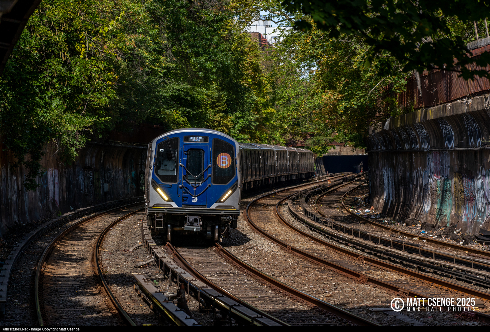 New York City Transit Authority (NYCTA) R211A car 3549 is the lead motor on a Brighton Beach-bound B train seen rounding the curve at Beverley Road station on the BMT Brighton Line.