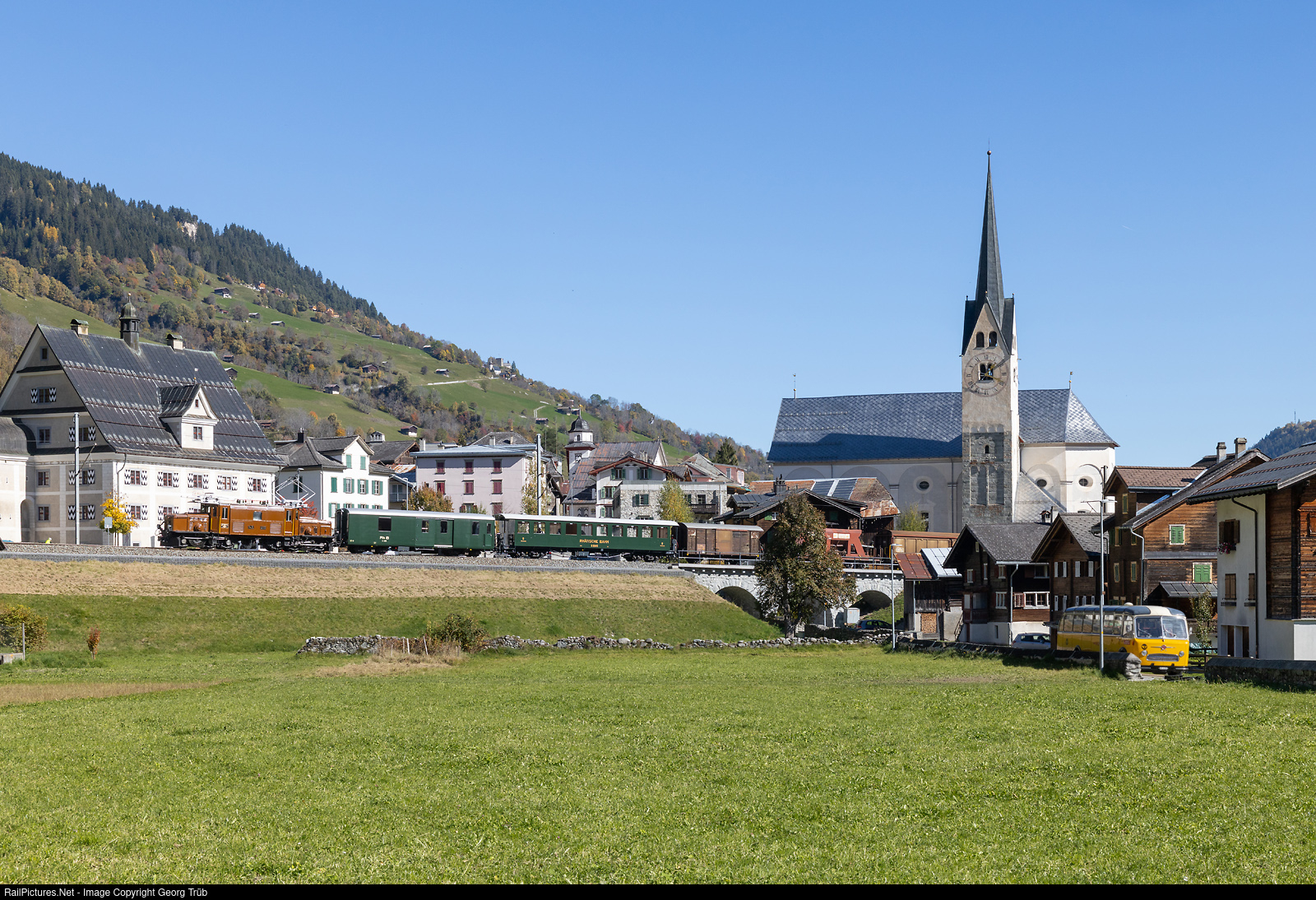 The "C-C" Ge 6/6 I # 415 of the Rhaetian Railway, built 1929, pulls a mixed freight/passenger train like in the 1970', leaving Trun bound for Disentis. This was a "FairFotoPass" photo run. The cars are: baggage D # 4205 built 1948, passenger car B # 2245 of 1928, covered freight car D2 # 4080, built in 1913 as Gbk-v # 5586, gravel transport car Fac # 8704 of 1968 and sliding doors car Haik-v # 5116 of 1970. On the right is post car of FBW type C4OU built in 1960 with 36 seats, used for the participants of the Photo run.