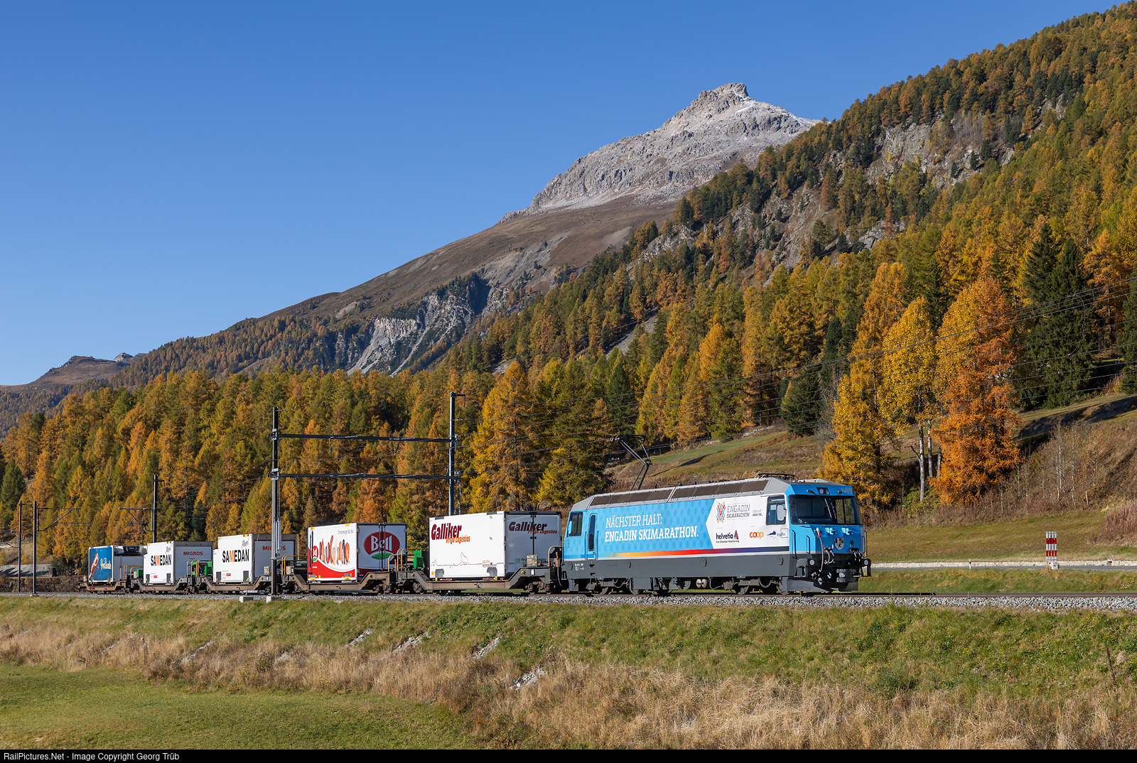 | Ge 4/4 III # 649 of the Rhaetian Railway, in the Engadin Skimarathon paint scheme, pulls the freight train 5336 from Samedan via Vereina to Landquart freight yard, between Samedan and Bever. |