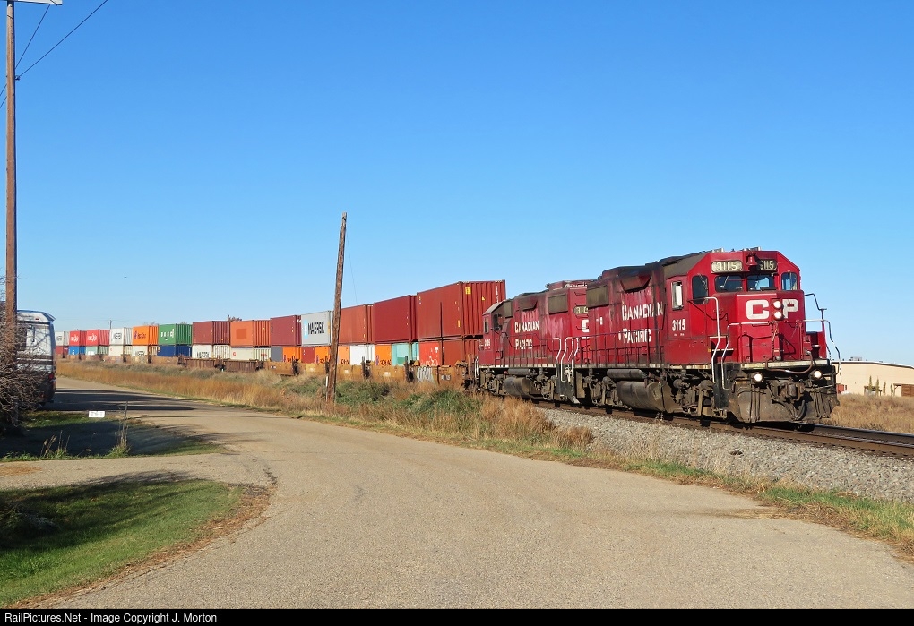 | CP 3115 pulls its consist out of the yard at Shepard. Interesting note: There used to be a train station near this location. The Shepard station can be found at Heritage Park in Calgary. |