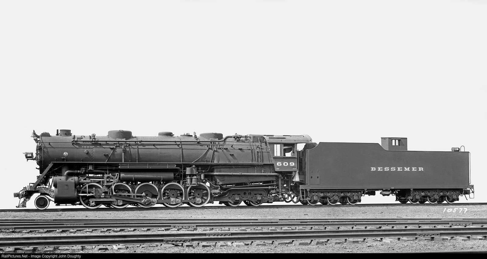 My great, great uncle Robert F. McKee, Sr., was a design engineer at Baldwin and he would give my father different Baldwin Locomotive Works builder's cards when my father would visit him in Collingswood, New Jersey. This 2-10-4 steam locomotive, number 609, was built for the Bessemer & Lake Erie Railroad. According to the specifications listed on the back of the builder's card this engine had a total weight of 872,300 lbs., and a tractive force of 96,700 lbs. This Baldwin Locomotive Works builders photo card is from the John R. Doughty collection.
