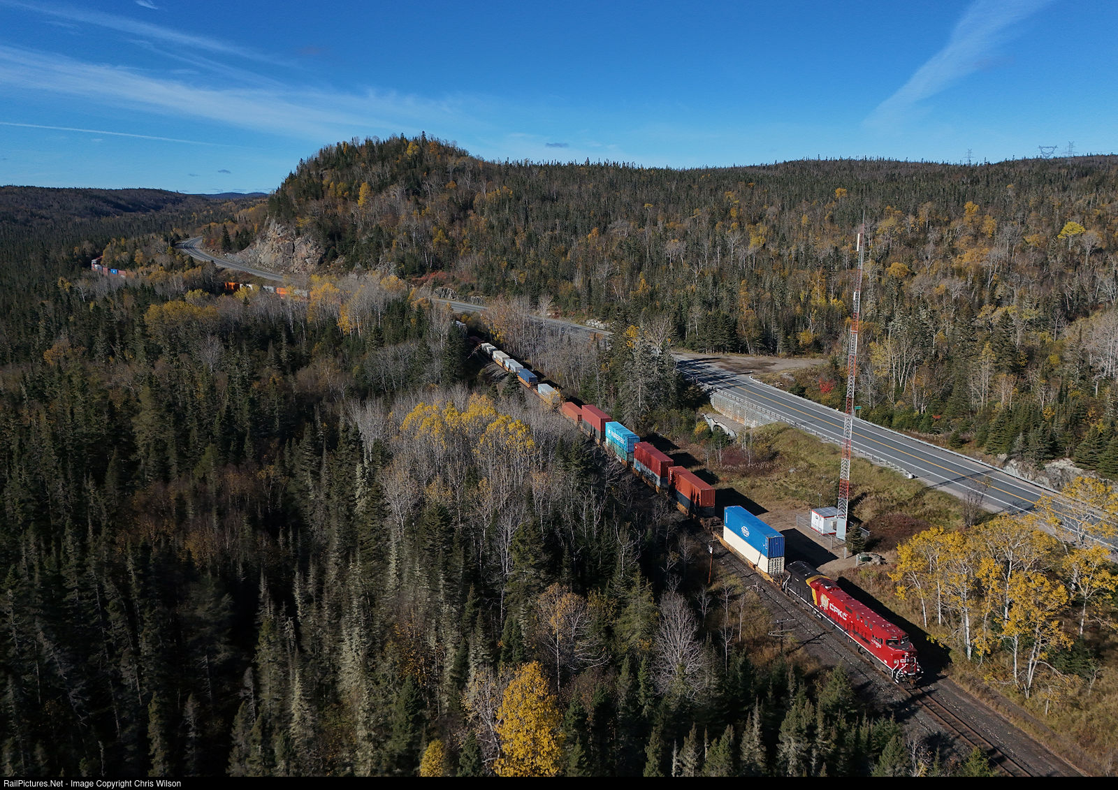 | CPKC train 100, the priority intermodal from Vancouver IMS, BC to Toronto Vaughan IMS, ON heads east along the Heron Bay Subdivision and beside the Trans Canada Highway. |