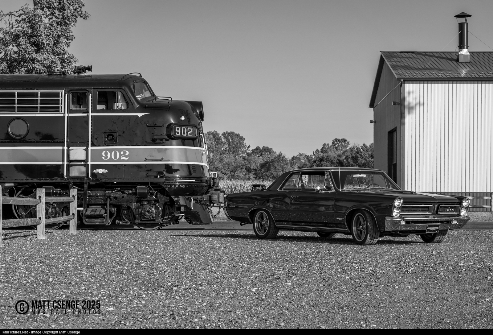 General Motors Muscle. Two very different forms of American muscle are on display at the Woodstown Central Railroad. Resting on steel wheels is Reading Company FP7A no. 902, built by the Electro-Motive Division (EMD) of General Motors in 1950. Riding on rubber tires is a 1965 GTO, manufactured by the Pontiac Motor Division of the same parent company.