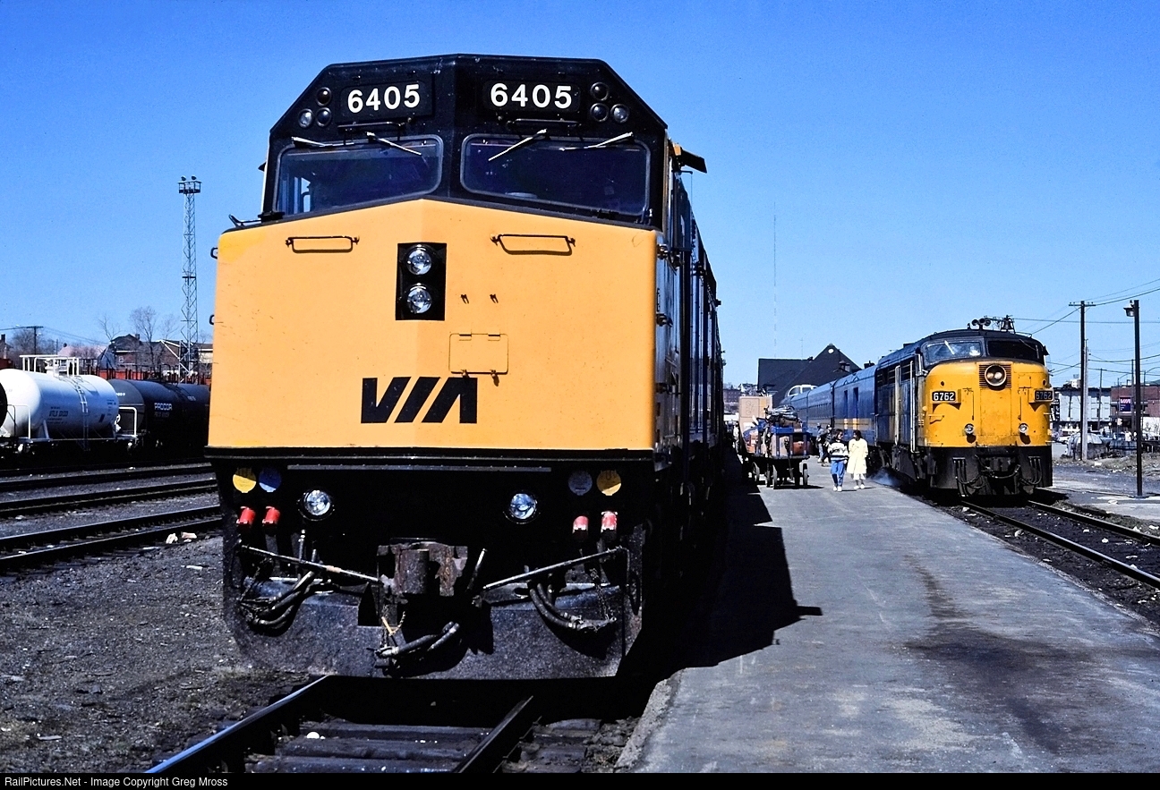 | VIA FPA4 6762 is ready to depart Sudbury, ON with train #12 in May of 1988. VIA 6405 will then depart with train #2 shortly thereafter. |
