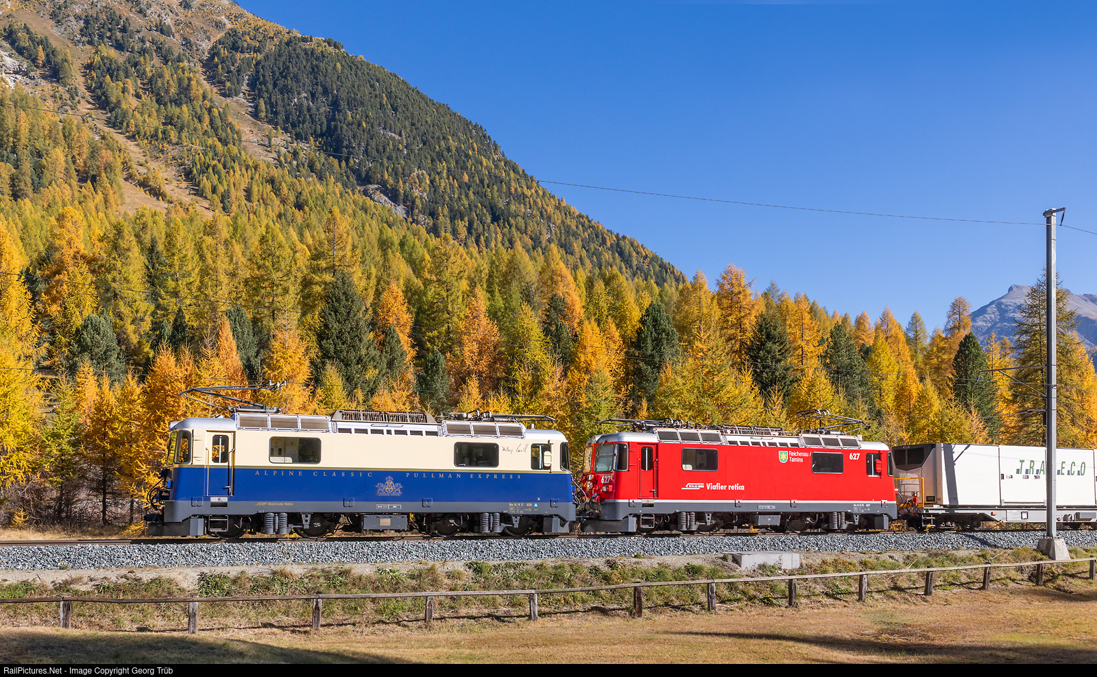 | Ge 4/4 II # 626 "Alby Glatt" and # 627 of the Rhaetian Railway in multiple control pull the northbound freight train 5140 from Samedan to Landquart freight yard through the Bever valley between Bever and Spinas. |
