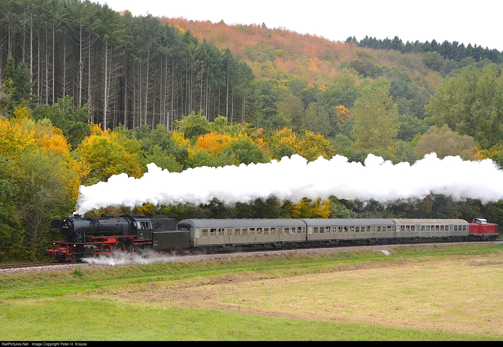 | 023 058 has left Lauterecken-Grumbach and Lohnweiler and is now speeding up to its next stop at Heinzenhausen on its way to Kaiserslautern. Commerorating the 50th anniversary of the end of steam in the Palatine area, the Ulmer Eisenbahnfreunde arranged passenger trains in schedule of regular trains. The V-100-Diesel at the backend is running in idle state and was only used for the opposite direction. |
