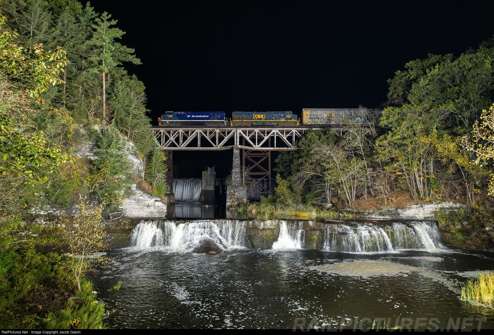 CSX's Pan Am Railways heritage unit passes over the falls at French's Hollow on M634 during the last few miles of the trains journey to Selkirk Yard.