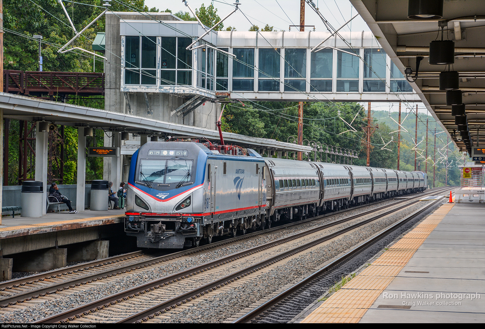 Making its stop at the BWI Thurgood Marshall Airport Station is Amtrak Northeast Corridor train 185, heading to Washington DC's Union Station from New York's Penn Station. AMTK ACS-64 "Cities Sprinter" 618 leads this nine-car train, with another ACS-64, 636, on the rear. (Linthicum, Maryland – September 24, 2025). Ron Hawkins photograph