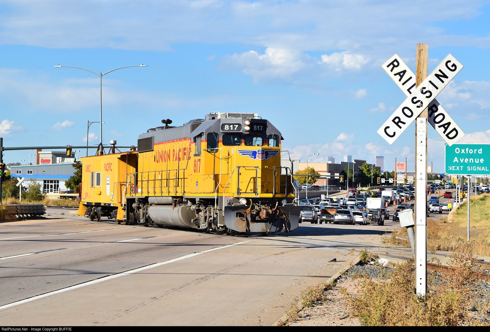 | UP 817 (GP38N) crosses a busy Santa Fe Drive in Littleton, Colorado, pulling a bay window caboose as a shoving platform.