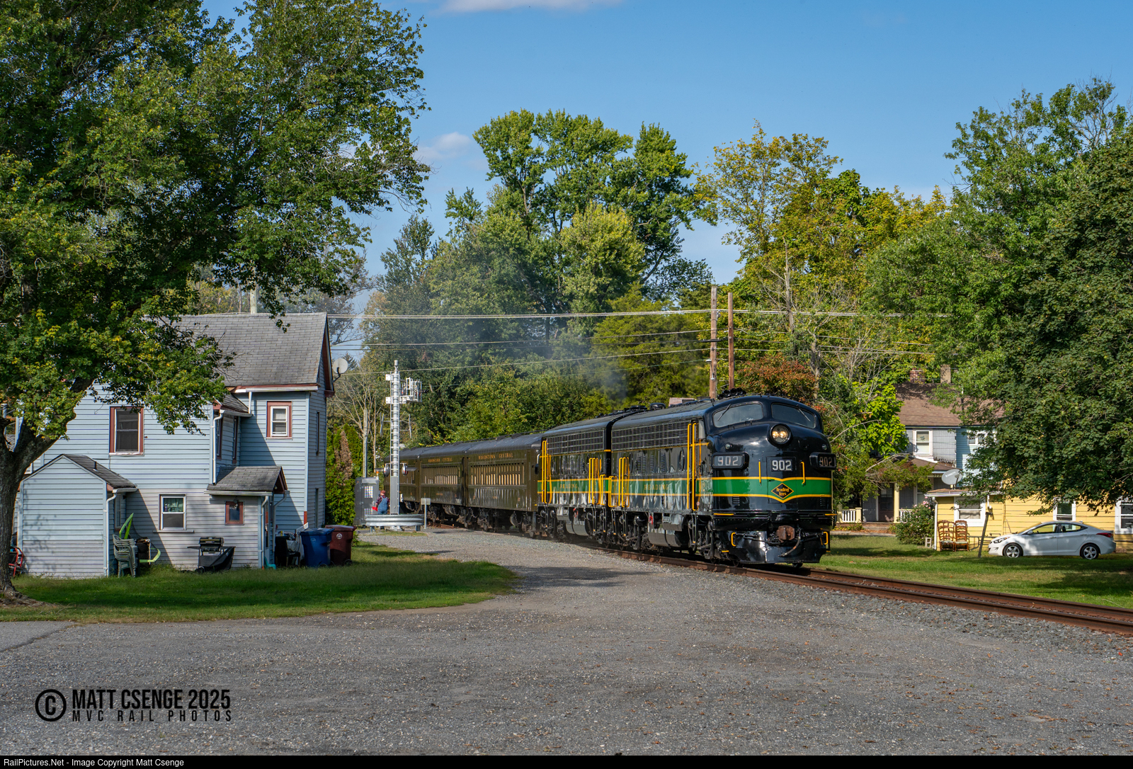 Reading Company FP7A no.s 902 and 903 are paired up to lead a short passenger train south out of Woodstown, NJ as part of a photography event at the Woodstown Central Railroad. |