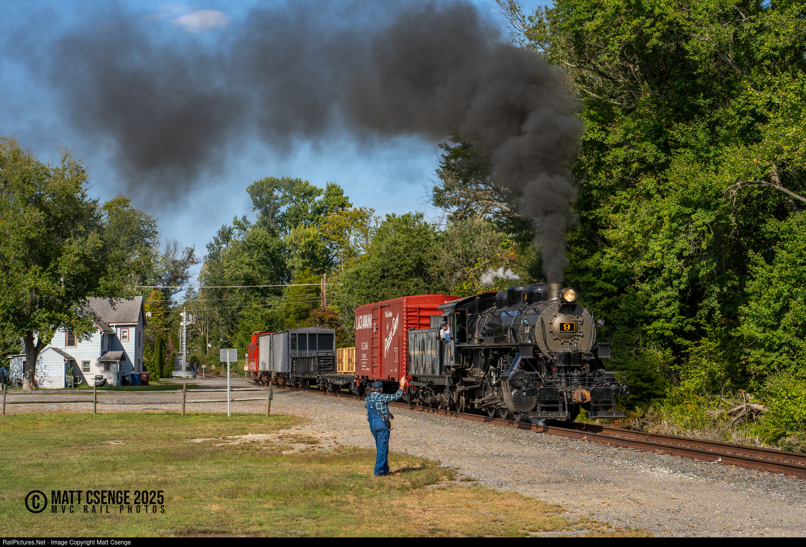 Railroad workers share a brief greeting as Woodstown Central Railroad 0-6-0 no. 9 steams south out of Woodstown, NJ with a short mixed freight. |