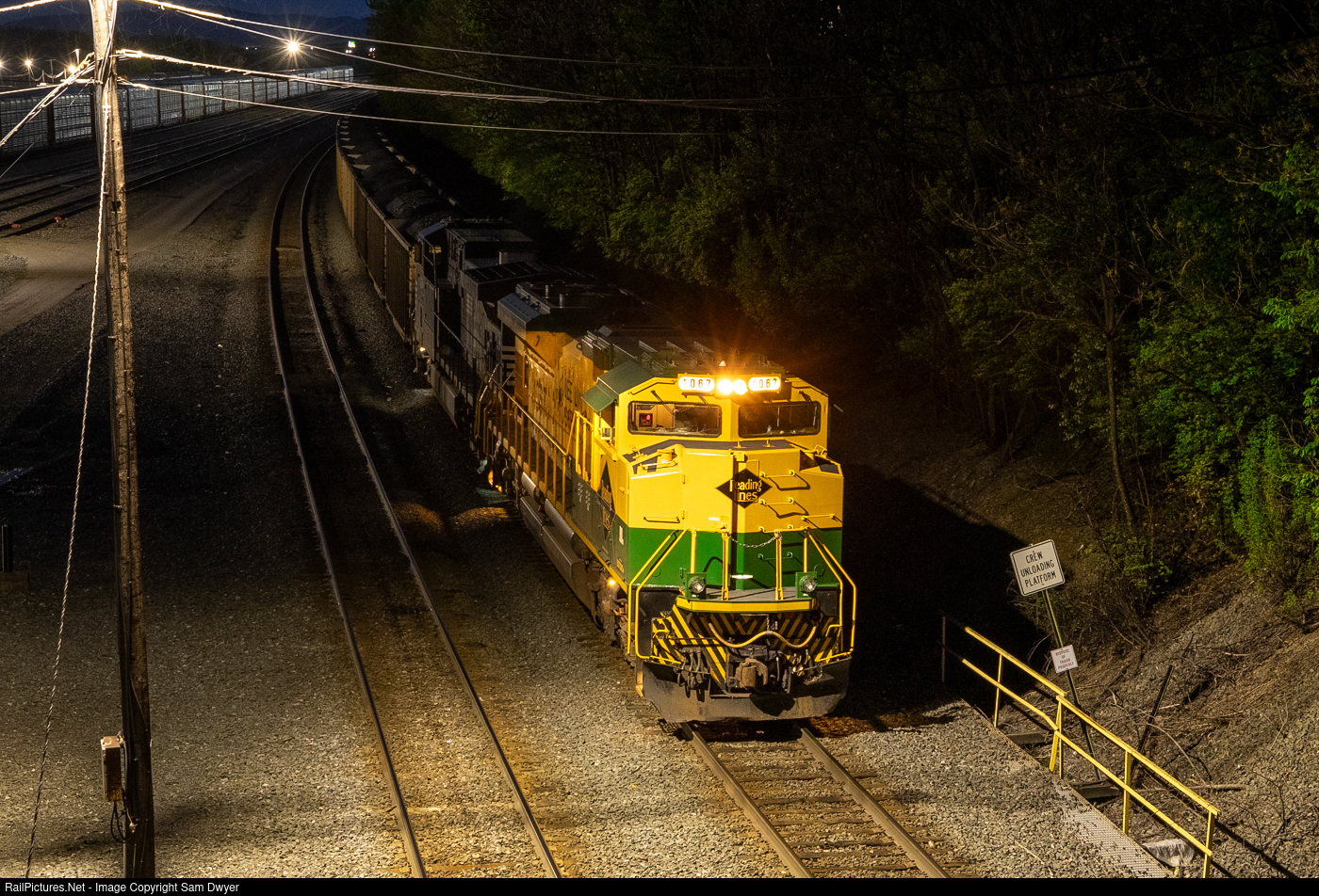 Bee Line NS 1067, the Reading Lines heritage unit, stops for a recrew at Rose Yard in Altoona, PA. This coal train is bound for the Brunner Island Generating Station in York Haven, which periodically receives bituminous loads from the Monongahela Valley.