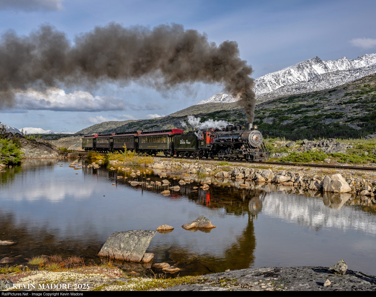 Mountain lake reflections. Southbound out of Fraser Meadows, the White Pass & Yukon's pretty Mikado #73 takes a short passenger special past one of many serene mountain lakes that dot the rocky landscape here. The train is at Milepost 21.4, with White Pass Station just a mile ahead.