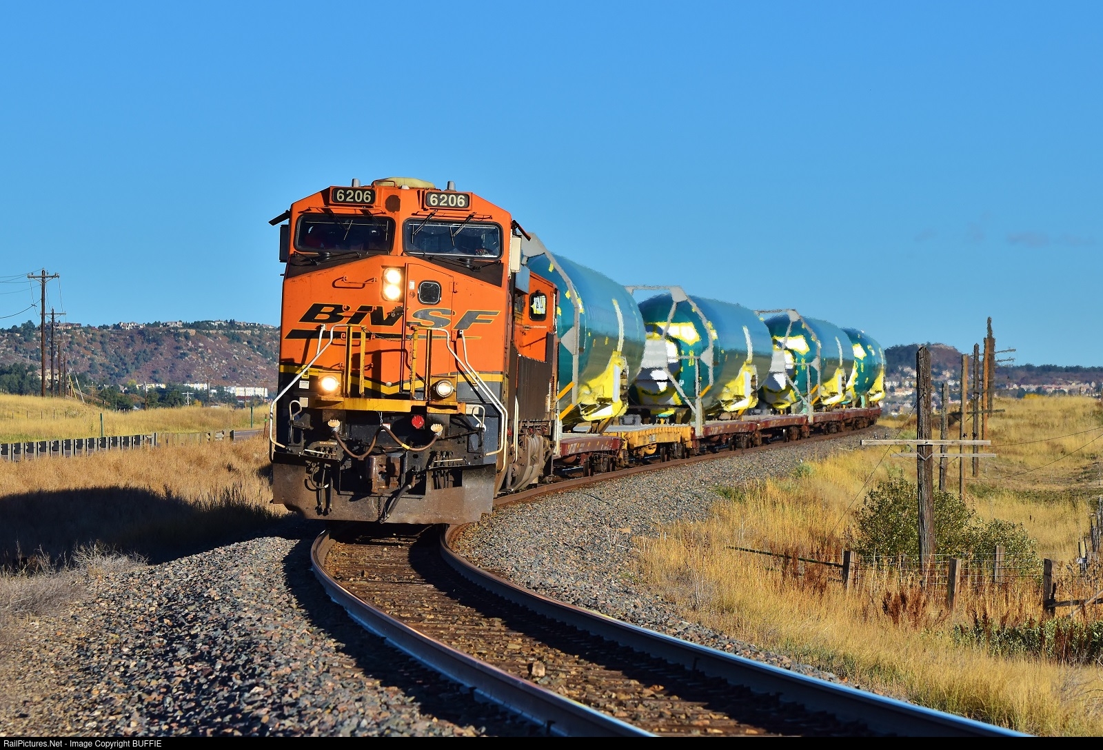 | BNSF 6206 (ES44AC) leads a Q train with 4 Boeing 737 fuselages through an S curve as it heads north on the Joint Line in Sedalia, Colorado.