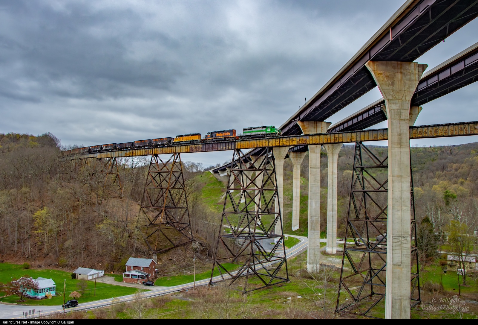 Wheeling and Lake Erie Road Job 618 flies over Mingo Creek Viaduct passing under the structure that carries PA-43 over both the railroad and the valley.