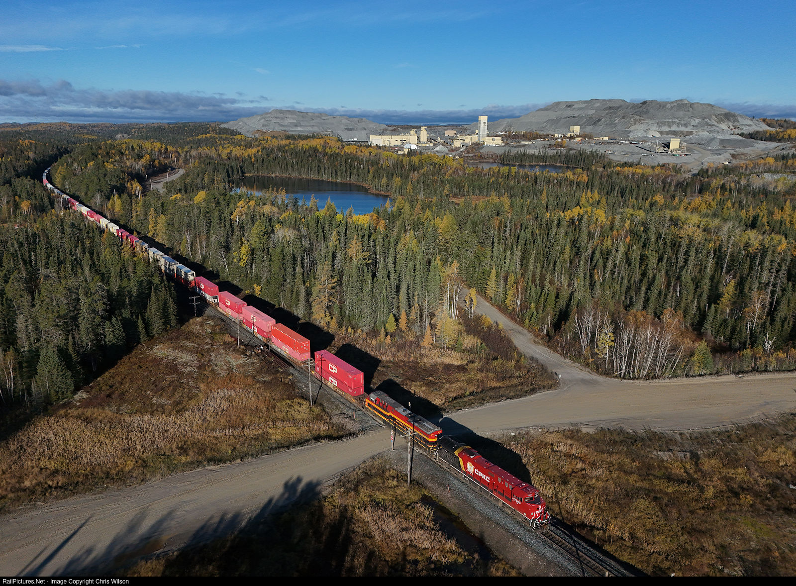 CPKC train 118 passes is approaching the west switch of Struthers passing the large gold mine owned by Barrick.