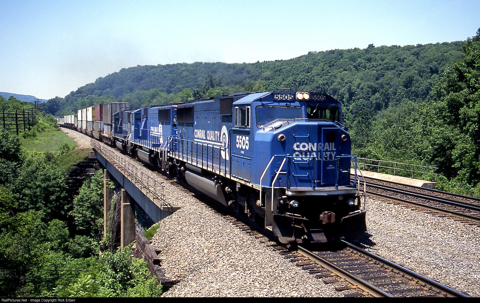 A trio of SD60Ms lead an eastbound trailvan on the long 1% grade from the Conemaugh River valley to Gallitzin. The train is crossing a reinforced stone arch bridge dating to the early 20th century a short distance east of Summerhill, PA. Fuji Sensia.