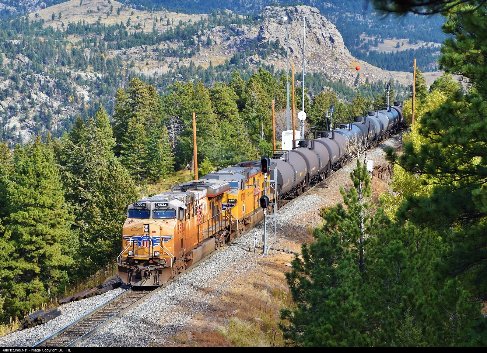 UP 5534 (ES44AC) shoves an oil can train through Crescent, Colorado as it heads to Denver on the Moffat Tunnel Sub.