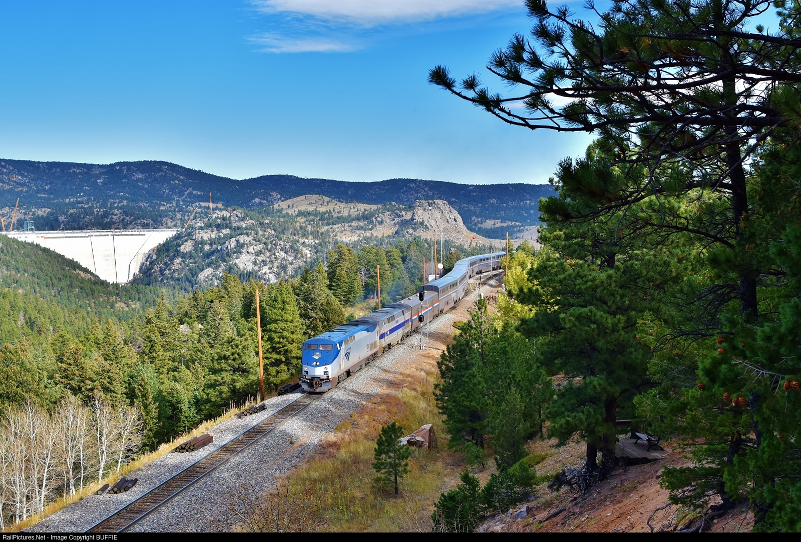 | A rare scene as the California Zephyr #5 train exits the seldom-used siding at Crescent, Colorado after waiting for an eastbound Union Pacific oil can train to pull through the switch on the main line. In the upper left you can see Gross Reservoir which is being expanded to hold more water for the developing Colorado Front Range.