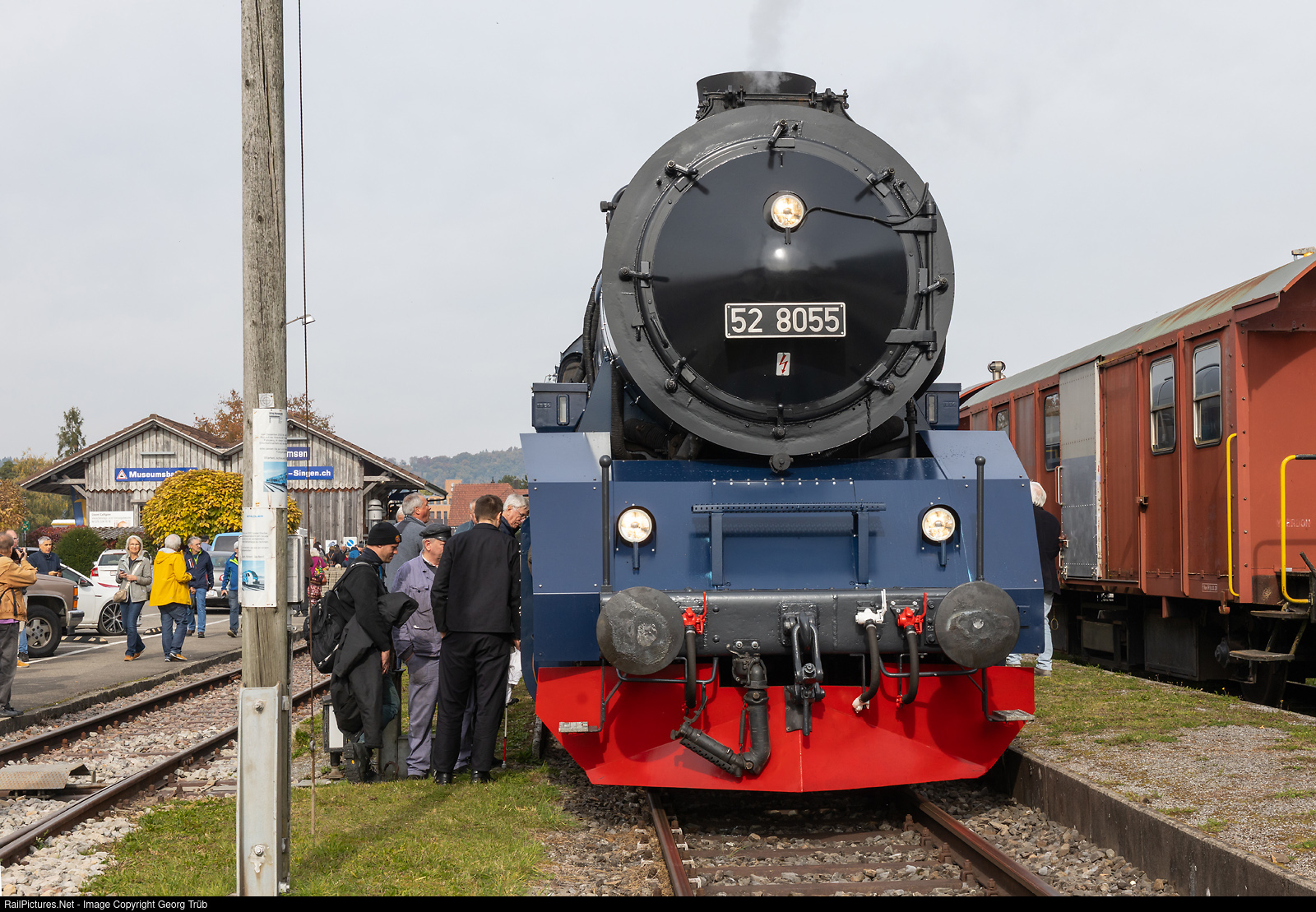 | The former German 2-10-0 freight train steam locomotive 52 # 8055 from Dampflokomotiv- und Maschinenfabrik (DLM) with light oil firing was severely damaged in January 2023 during a fire at the locomotive depot in Schaffhausen. On that day, it was making its first trips after being put back into service on the Etzwilen-Singen museum railway. The locmotive is standing in Ramsen with the afternoon train from Singen am Hohentwiel/Germany to Etzwilen. |