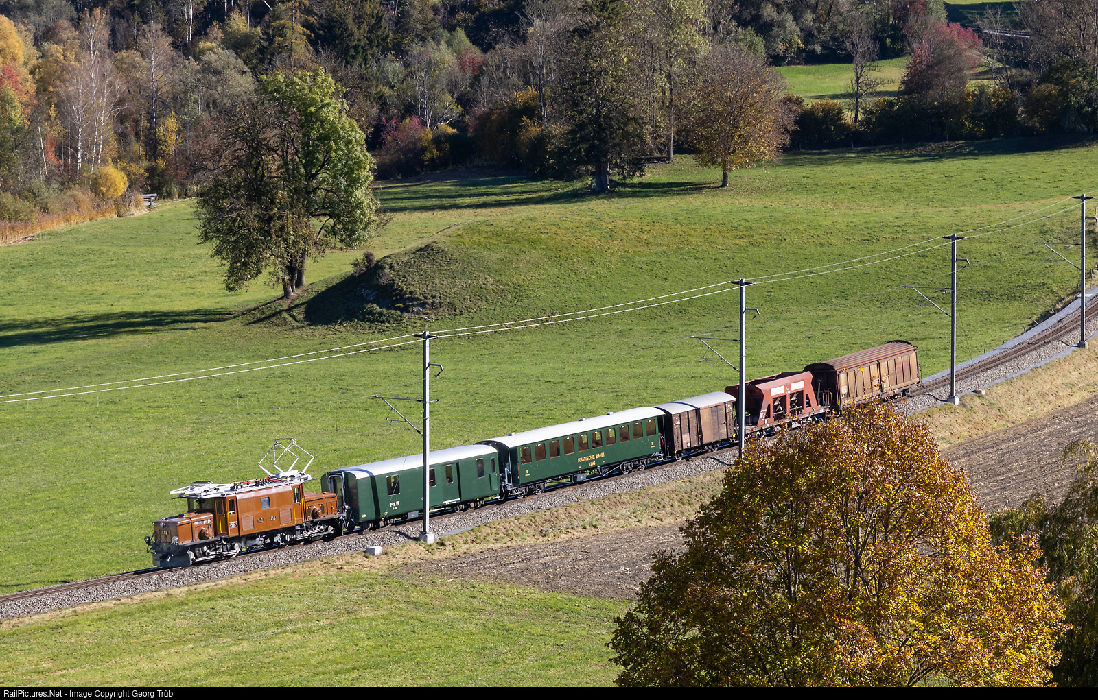 The "C-C" Ge 6/6 I # 415 of the Rhaetian Railway, built 1929, pulls a mixed freight/passenger train like in the 1970', between Castrisch and Ilanz. This was a "FairFotoPass" photo run. The cars are: baggage D # 4205 built 1948, passenger car B # 2245 of 1928, covered freight car D2 # 4080, built in 1913 as Gbk-v # 5586, gravel transport car Fac # 8704 of 1968 and sliding doors car Haik-v # 5116 of 1970.