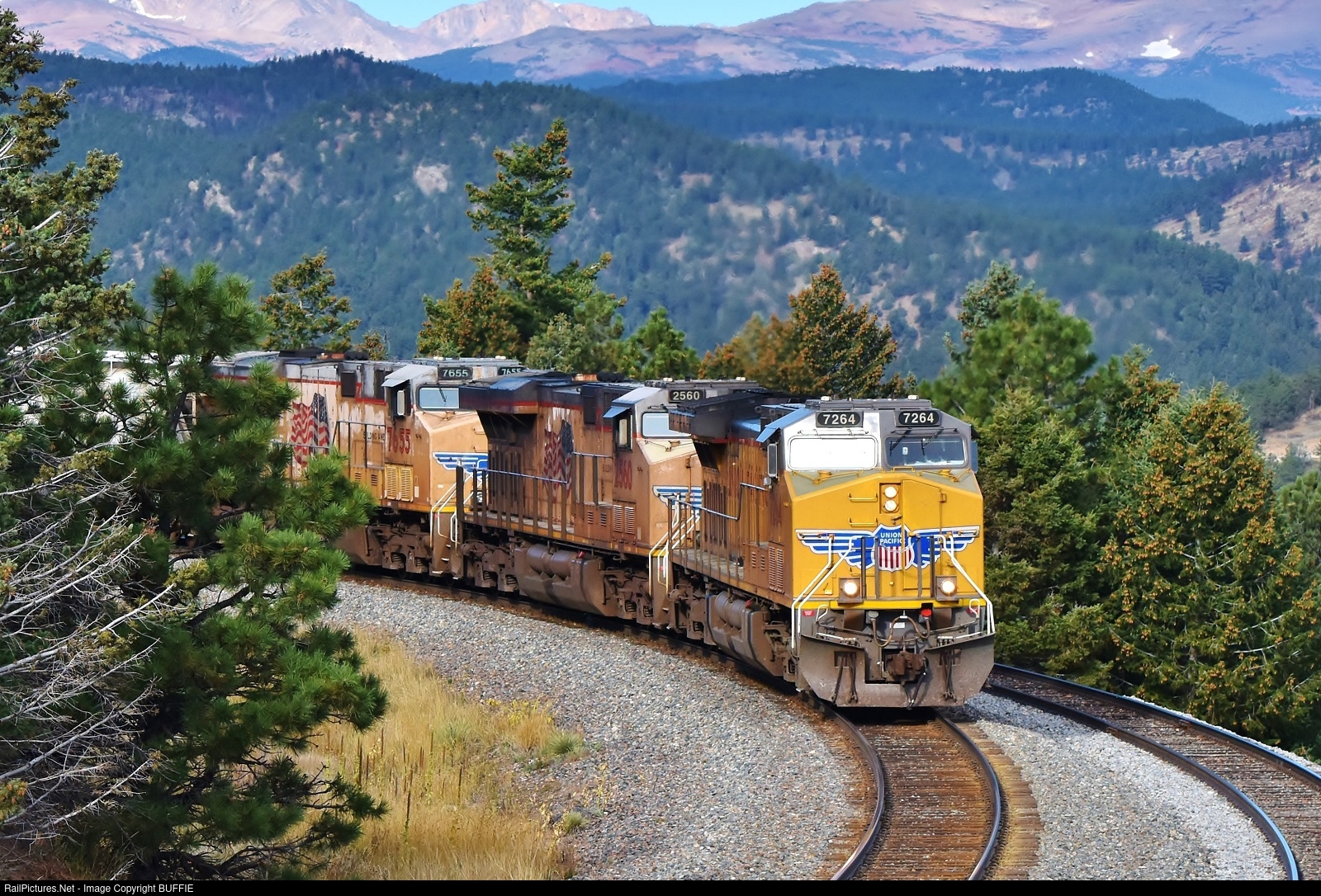 | UP 7264 (AC4400CW) leads an oil can around the sweeping curve at Crescent, Colorado as it heads to Denver on the Moffat Tunnel Sub.