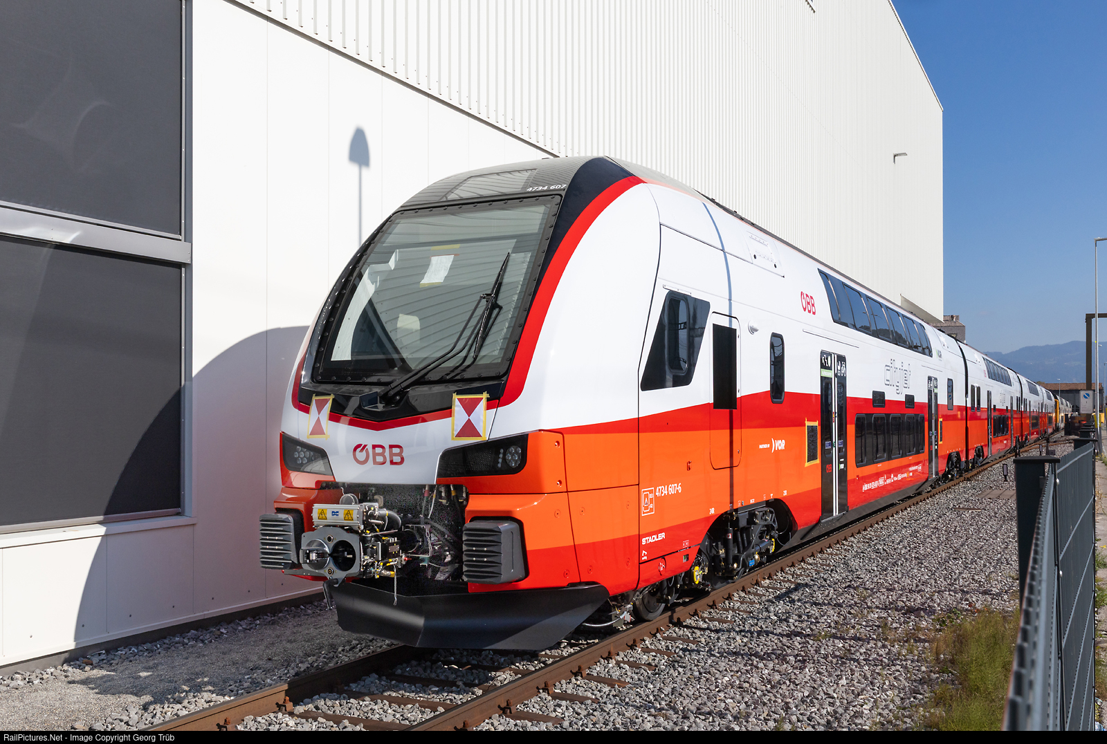 | Four-part double-decker train KISS CityJet 4734 # 607/107 for Austrian Federal Railways (ÖBB), ready for delivery at the StadlerRail site in St. Margrethen. |