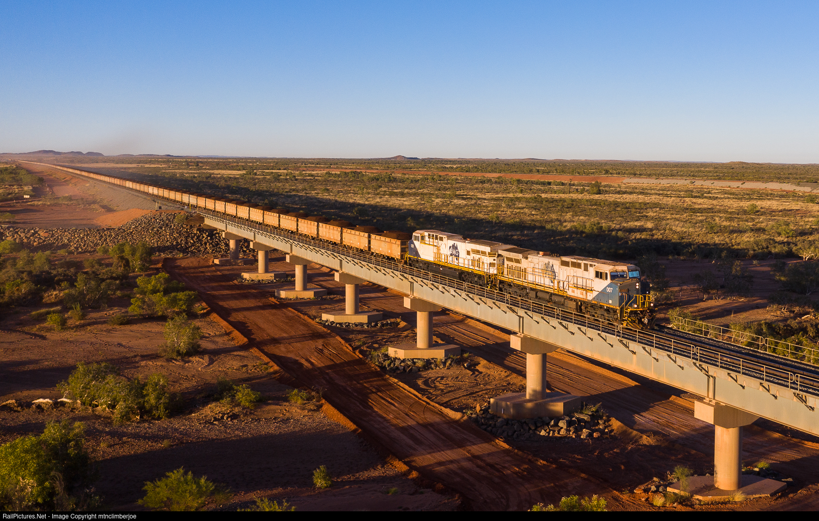 With the rising sun casting long shadows across the desert landscape, a loaded FMG iron ore train cruise north behind a C44-9W and an SD70ACe. The train is crossing the bridge over the dry bed of the Oakover River north of Barker, Western Australia.