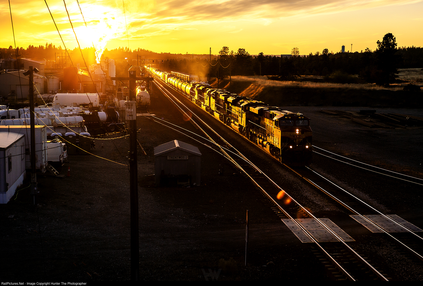 Trentwood Dusk | As the sun approaches the horizon near the end of a warm Tuesday, October 21, 2025, a northbound manifest freight train rolls through control point Trentwood in Spokane Valley, WA. With a fresh UP crew aboard, the train is bound for Eastport, ID where it will be handed off to the CPKC.