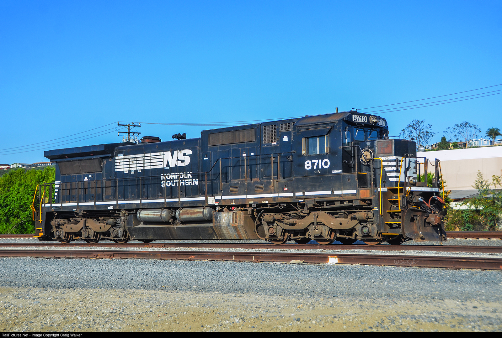 Norfolk Southern Railway Dash 8-40C 8710 sits alone on Union Pacific’s Dolores Industrial Lead, at the northern end of UP’s Dolores Yard. Locomotives from other railroads, in other parts of the country, are not uncommon here, as many of the port-bound intermodal trains originate on railroads east of where the UP operates. (Compton, California – June 22, 2015)