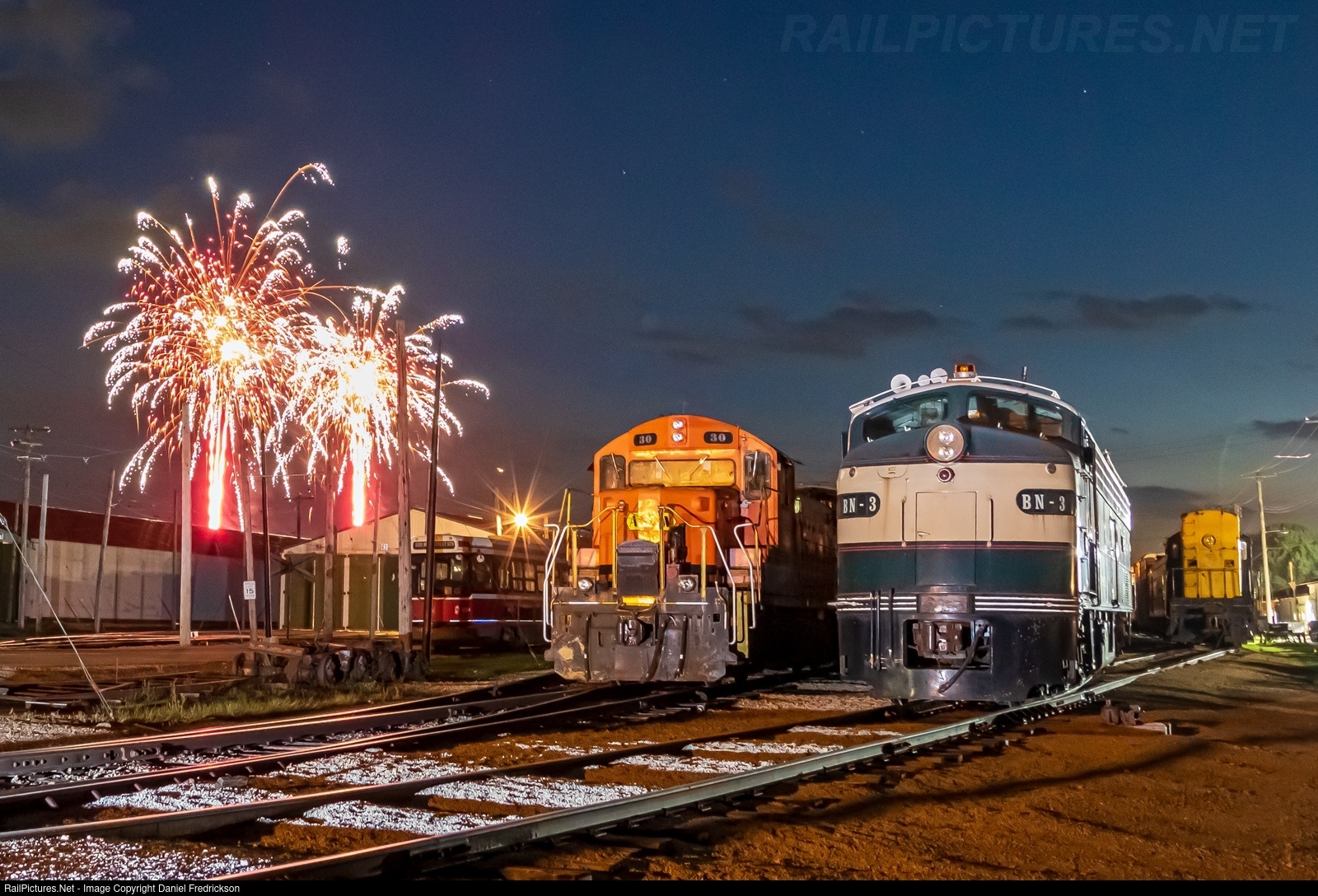 Fireworks light up the evening sky as C&IM 30 (RS1325) and BN-3 (E9AM) rest quietly at the east end of the yard during the Illinois Railway Museum's 2025 Labor Day weekend.