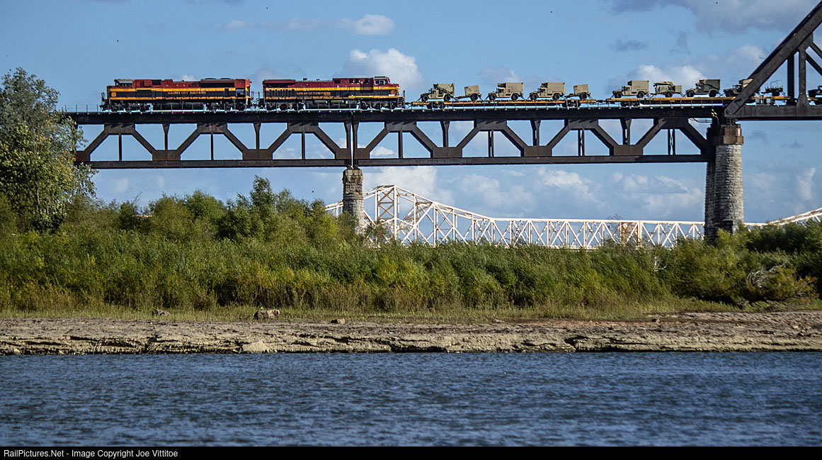 Two KCS Belles lead a northbound military train north over the LIRC as it enters Indiana.