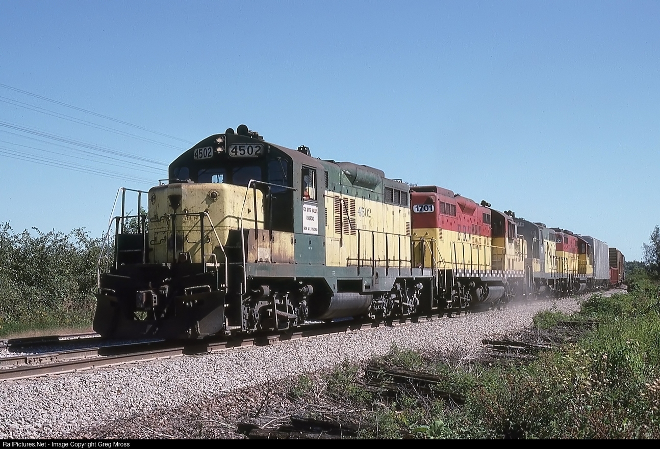 FRVR 4502 leads a northbound (timetable West) freight into the ex-CNW yard in North Fond du Lac, WI in July of 1989.