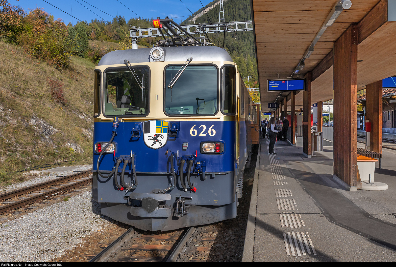 | The Ge 4/4 II # 626 "Alby Glatt" (Malans) of the Rhaetian Railway in the cobaltblue/ivory paint scheme is standing on track 3 of Filisur with train 92050 ALBULA PULLMAN EXPRESS of MANU Touristik bound for Davos Platz. The guests enjoyed a coffee break at the Grischuna hotel near the station. This train will circulate from 2026 every wednesday from may to october from Davos Platz to St.Moritz and back for guests of MANU Touristik. |