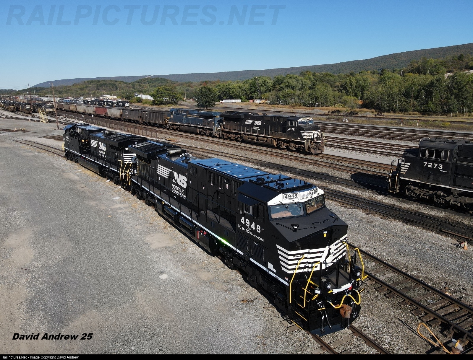 NS 4948 and 4947 are finished, and waiting to be picked up at the Juniata Shops, as a westbound empty coal train passes by on the main with the TAG Heritage trailing. Note the 4947 has special logos applied for being the 1000th DC/AC conversion on NS.