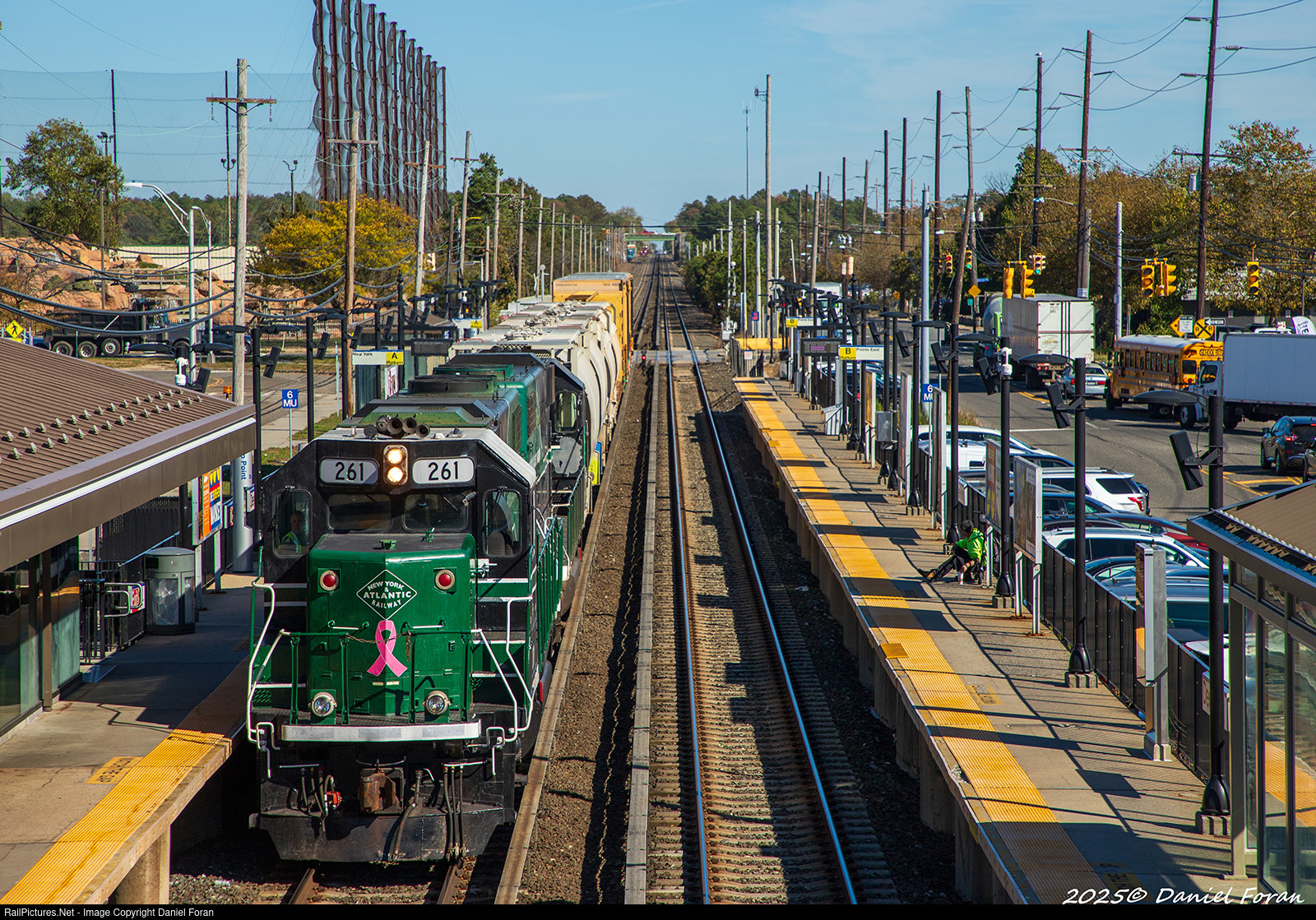 | Due to track work taking place in Pineaire the last few weeks, the RS71 has been forced to shove their empties into Pilgrim. Viewed from the pedestrian overpass in Deer Park, GP38-2 261 is seen supporting a Breast Cancer Awareness sticker for the month of October. |