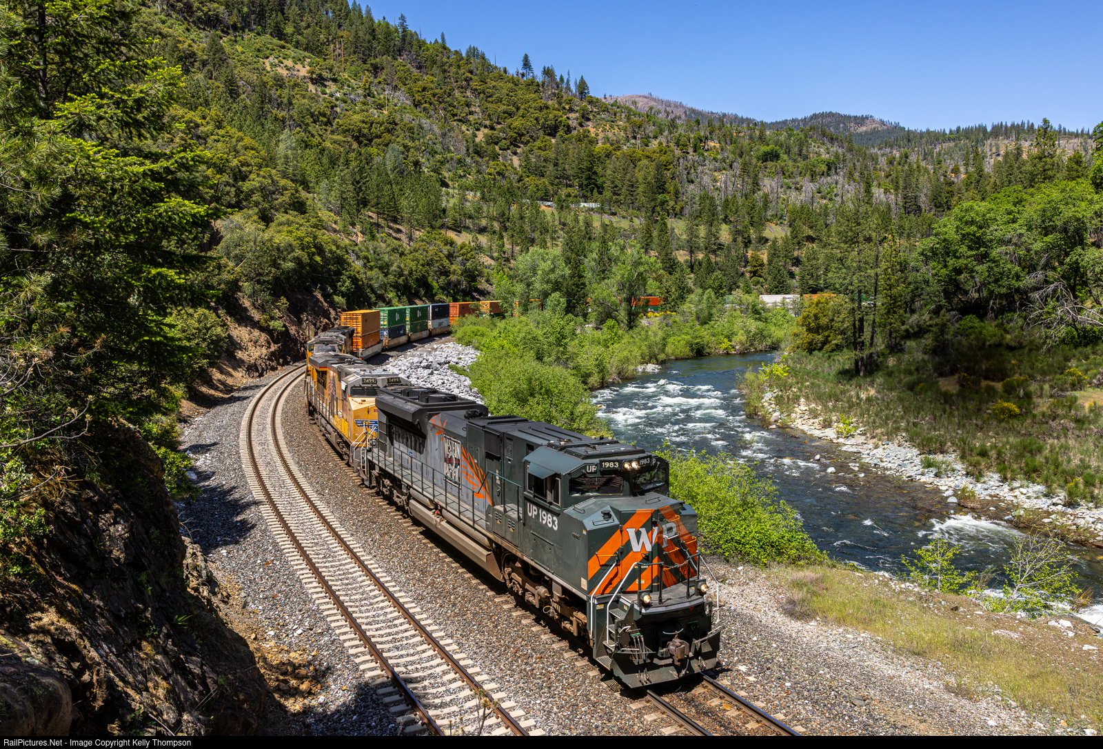 | With a fresh Dunsmuir crew on board, UP 1983 straddles the Sacramento River as they come down from Mt. Shasta into Gibson. |