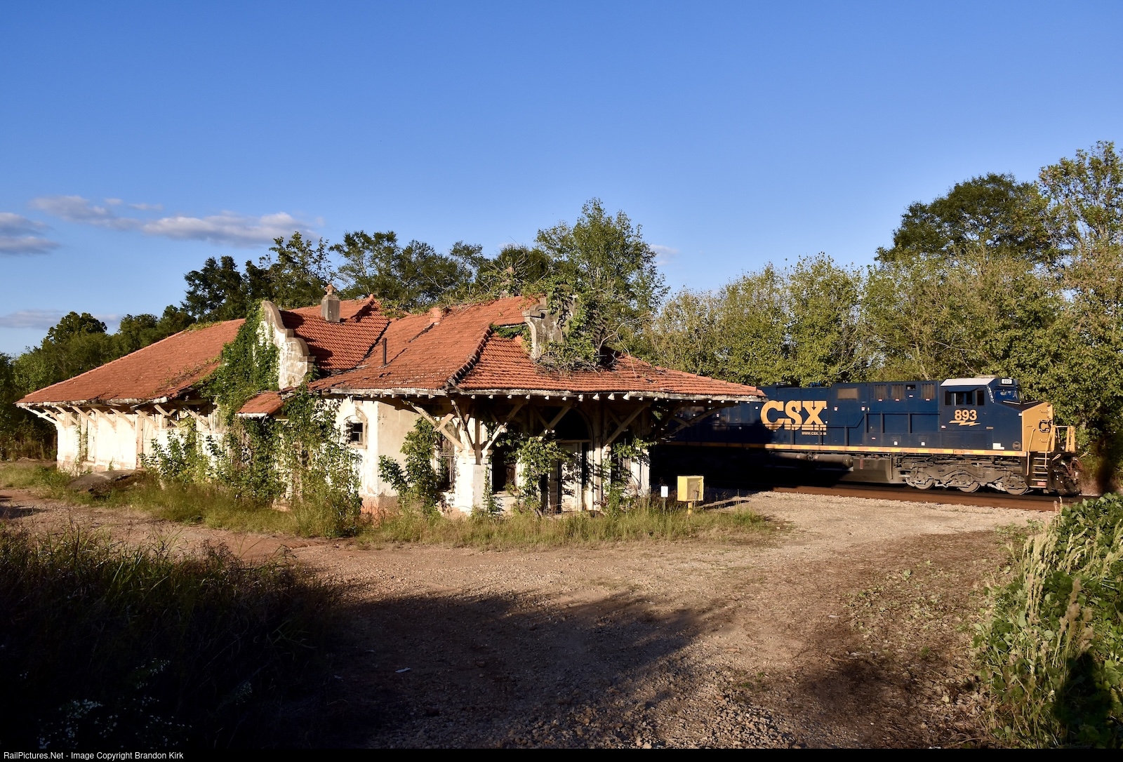 Rushing south pass the old Atlanta, Birmingham, and Atlantic Railroad Depot, is Waycross bound manifest train X515. The extra movement of freight has a locomotive "PURRING" in the middle of it as a DPU. Of course, I'm referring to the CSX Chessie System heritage unit (#1973). The boss making all the calls today is CSXT #893. It crusies by the historic structure with the suns golden light highlighting them both on a beautiful Fall day.