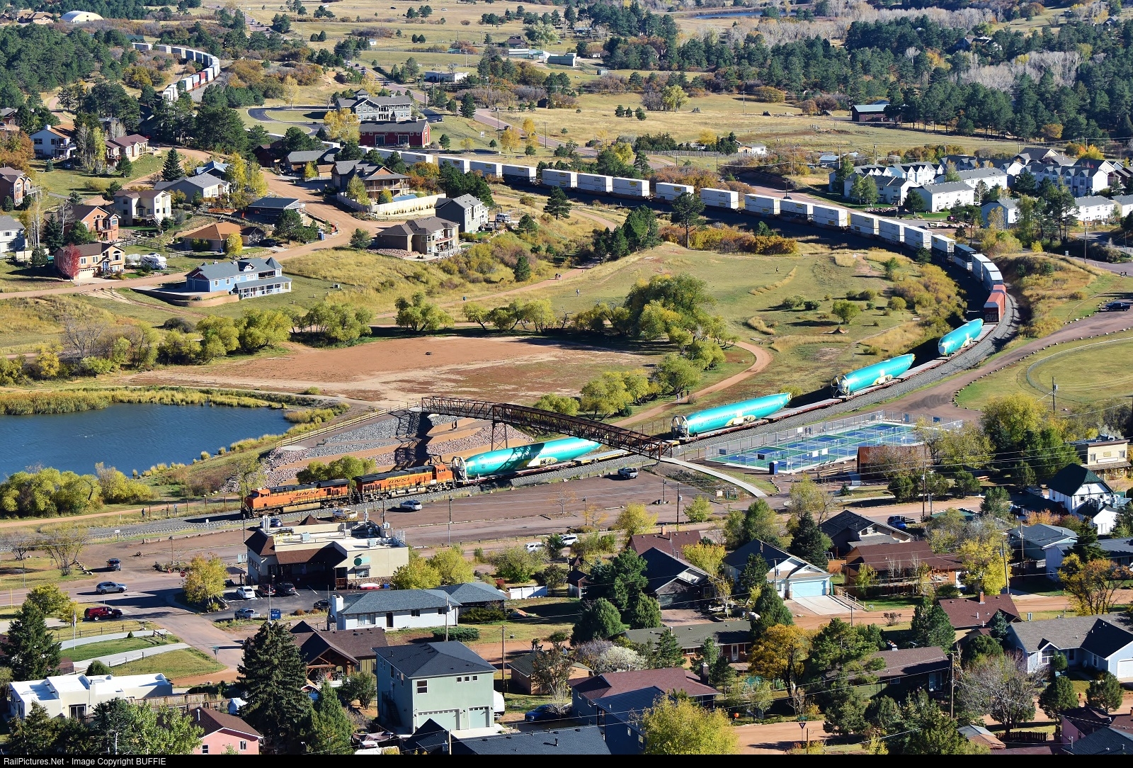 | BNSF 6206 leads a Q train with four Boeing 737 fuselages as special cargo as it rounds the lake in Palmer Lake, Colorado. |
