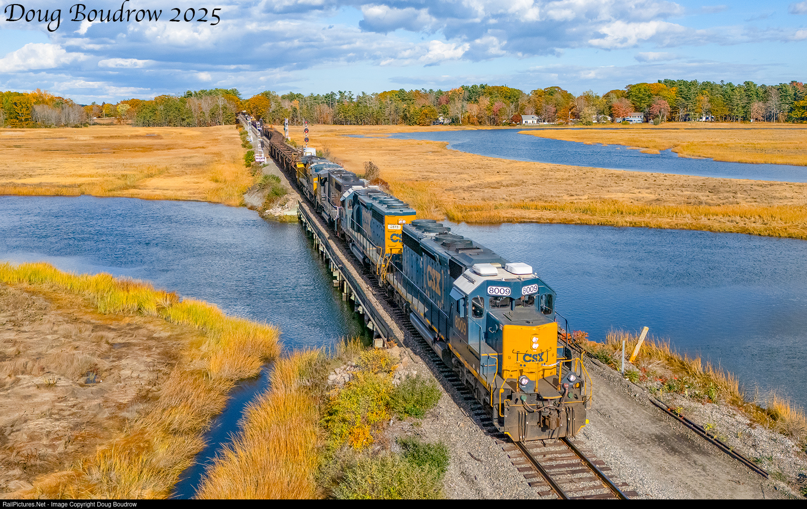 | Just a a couple of miles out of Rigby Yard, L080 is accelerating to track speed as they cross over the Nonesuch River at Scarborough Marsh. The train runs to Lawrence, MA and return. |