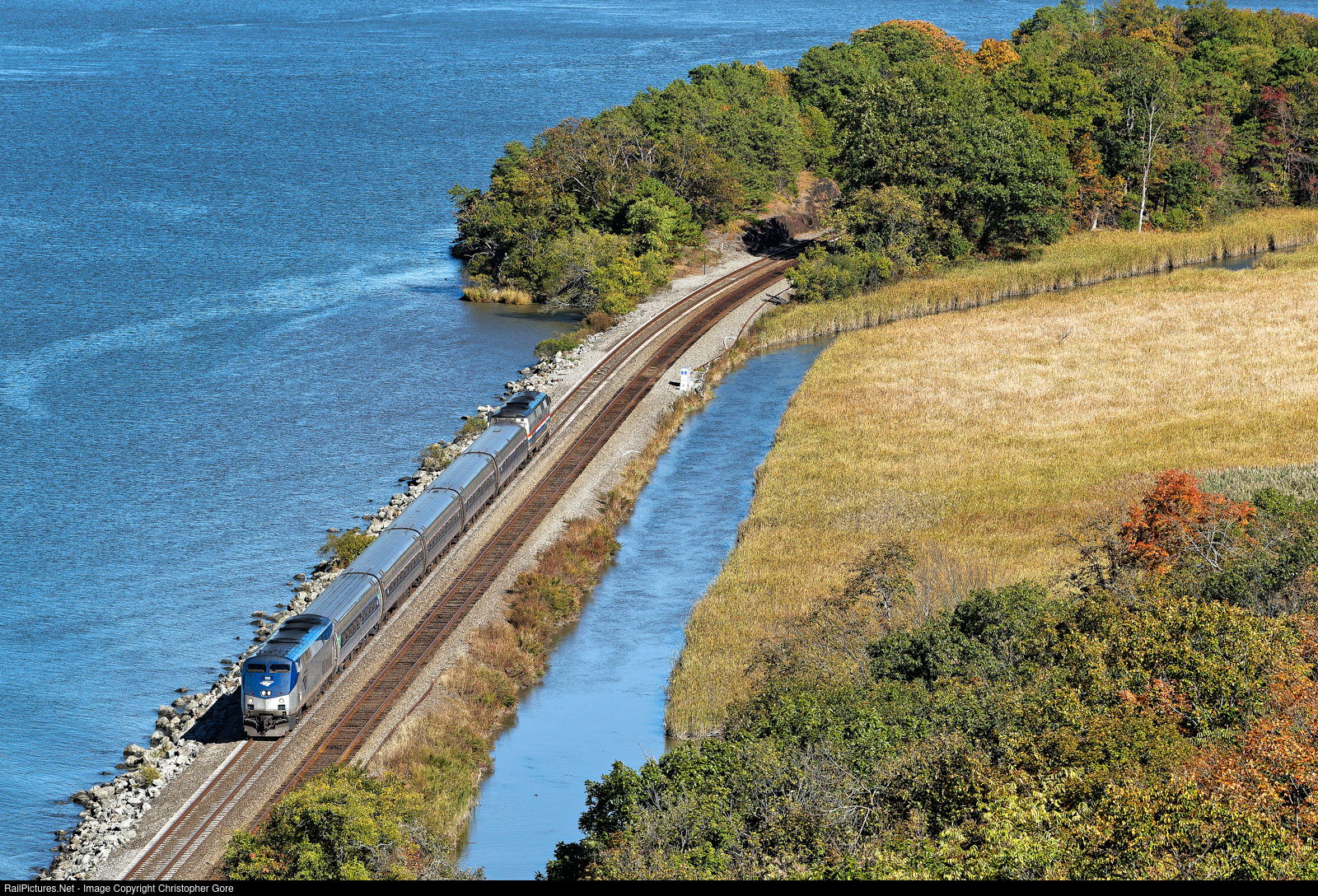 Empire Service train 280 running along the Hudson River at Cortlandt, New York.