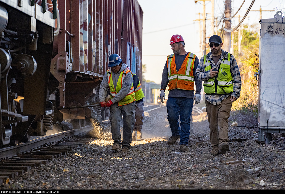 On October 21st, 2025, New York & Atlantic Railway (NYA), in collaboration with Railroad Construction Company (RCC) and the Long Island Rail Road (LIRR), operated a work train to drop fresh ballast on the “Straight” and “Back” tracks within the railroad’s Pine Aire Yard in Brentwood, New York. Both tracks are currently undergoing heavy maintenance to improve their overall condition and ensure continued reliable service. In this photo, the RS-90 conductor walks with the RCC workers as they man the chutes during the first stone drop on the "Straight".