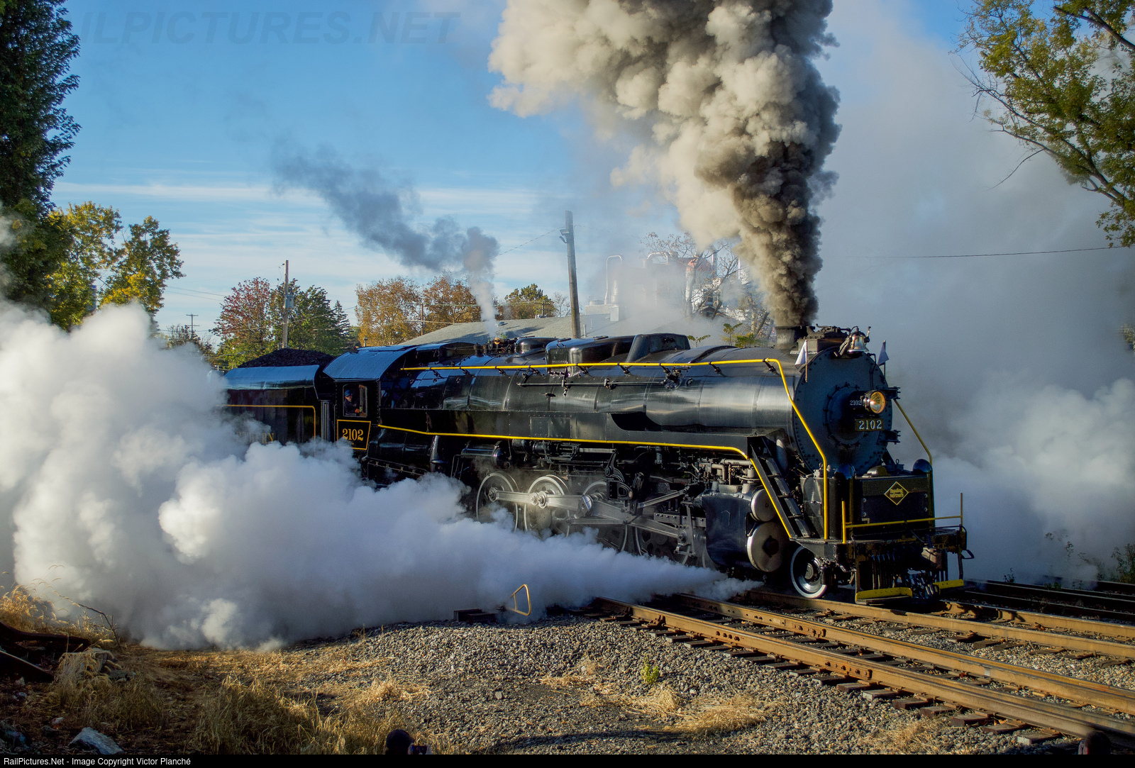| On a glory morning, the last Reading Blue Mountain & Northern steam-powered Fall foliage excursion of the season is now leaving the Reading Outer Station. RBMN 4-8-4 T1 2102, built in 1945 by the Reading Company, is once again leading this train since its restoration in 2022. |