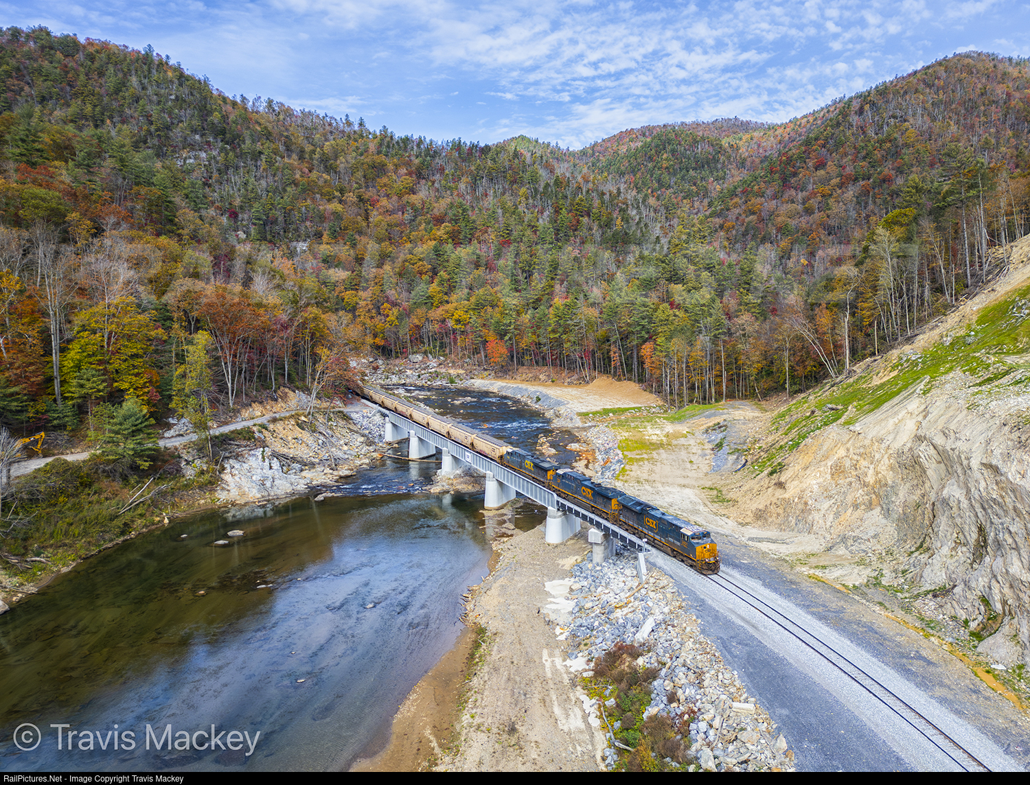 CSX G817 with grain loads for Case Farms in Shelby, NC crossing the Nolichucky River at Poplar as it exits the Nolichucky Gorge
